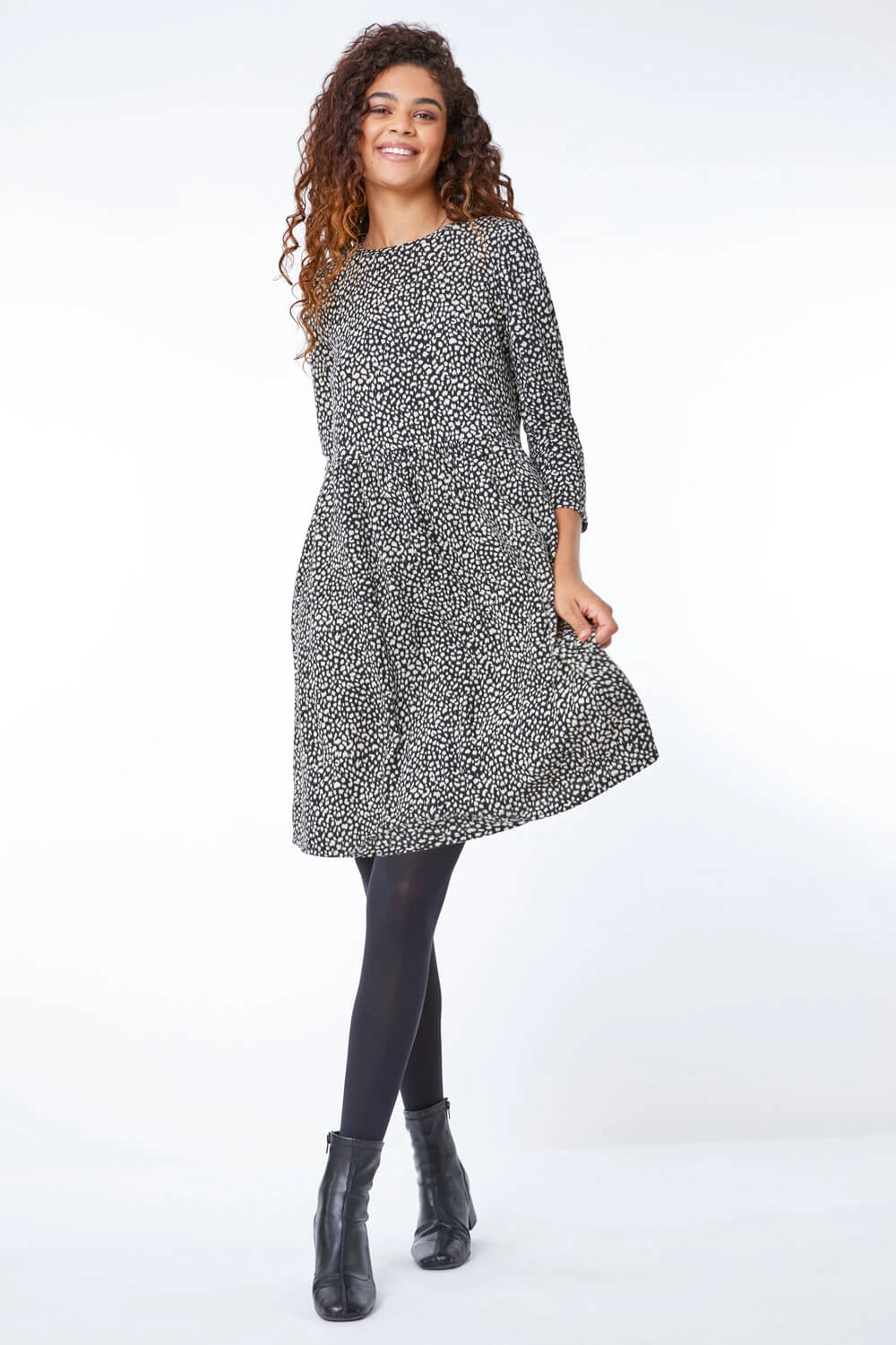 Be cosy and casual with this animal print, woolly touch dress. Cut from a stretch jersey fabric this piece is both comfortable and stylish, with its chic animal print. It features a modest round neckline, fun ¾ length sleeves and a relaxed waist line. Its cut in a fit and flare style and finishes at the knee. Pair with tights and boots for an on trend, off duty look!