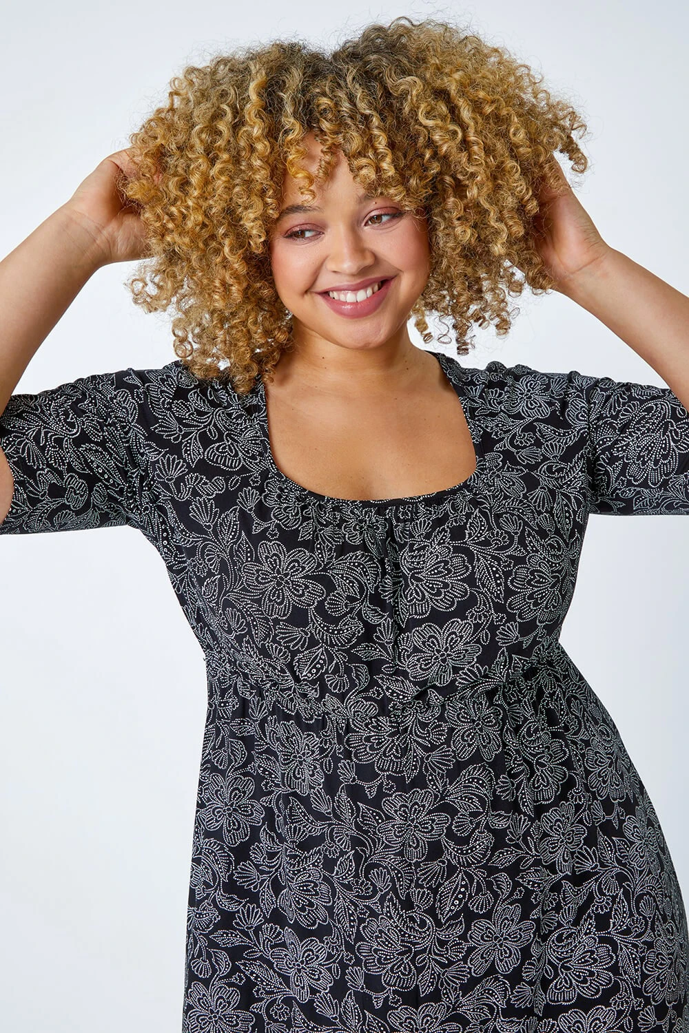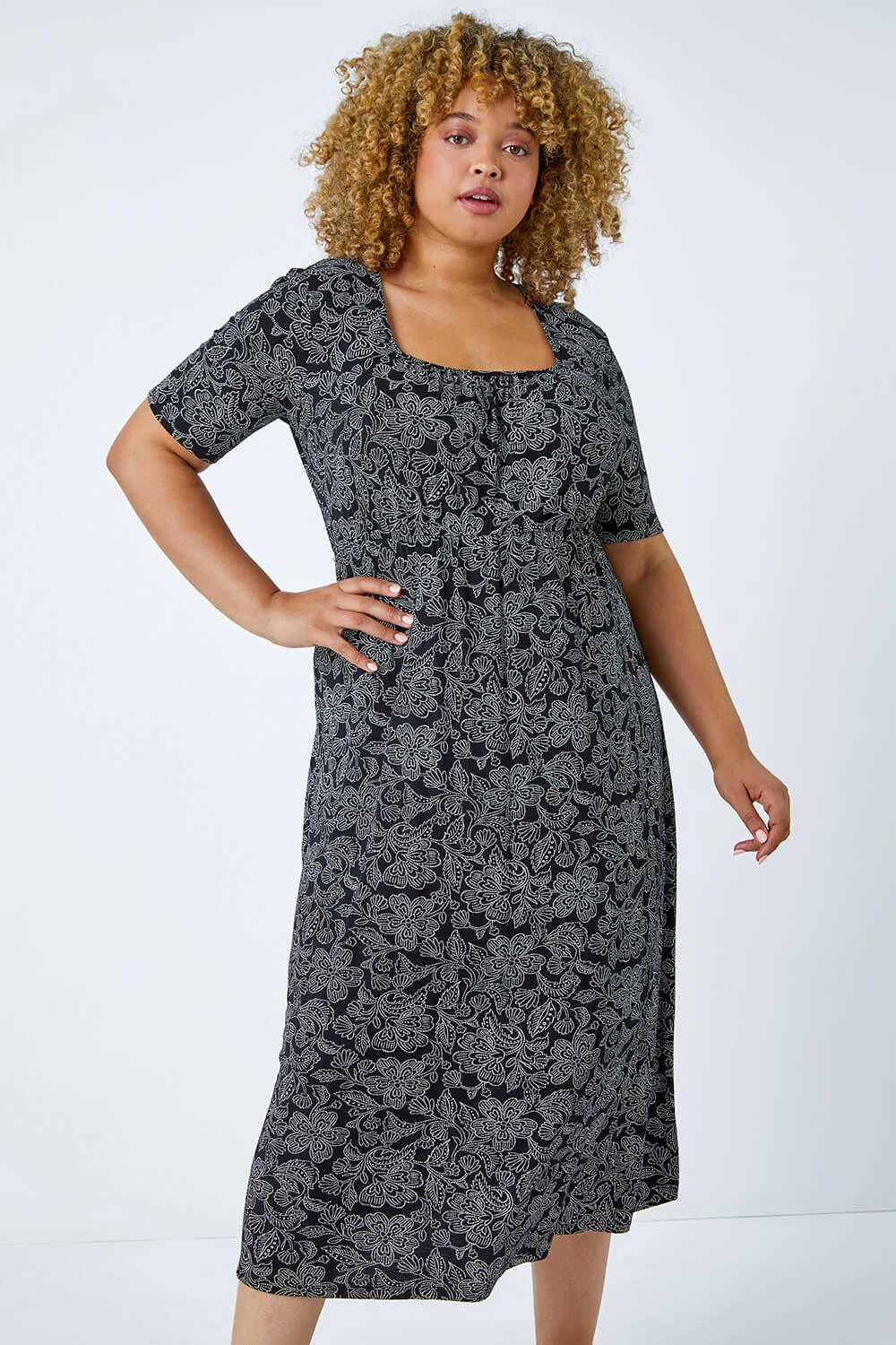 Adorned in a dark, floral print this curve midi dress is fun and easy to wear. Cut from a stretch jersey fabric this piece features an unusual square neckline and short sleeves. An elasticated empire waistline ensure a loose and flattering fit throughout the piece. Designed to pull on overhead for comfortable and quick dressing, this piece is perfect with fresh trainers and a denim jacket!