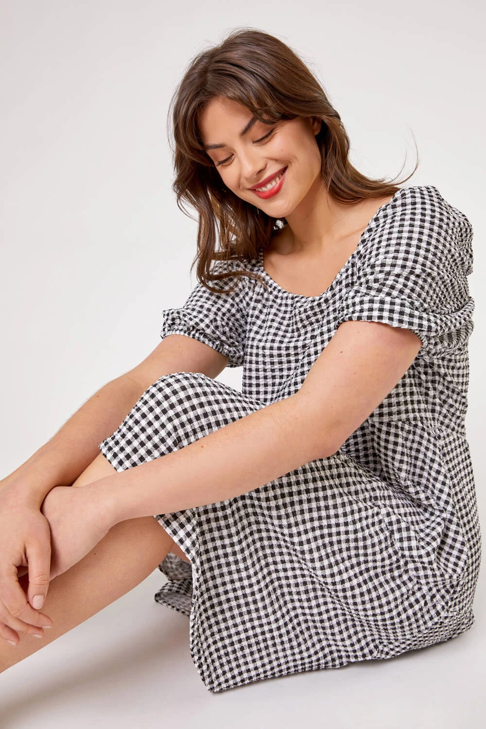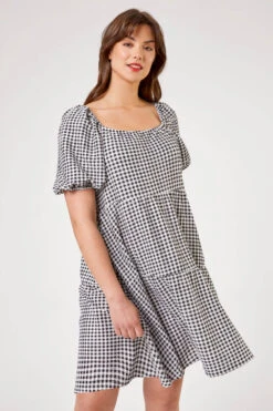 Start summer right in our beautiful gingham tiered dress from the Curve collection. With an all over gingham check print, this dress features a square neck with an option to wear off the shoulder. This classic print dress offers short elasticated cuff sleeves for those warmer days. Team with some ankle boots and leather jacket for an off duty look or with a denim jacket and some pumps for day wear.