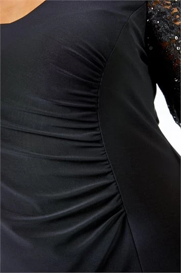Keep it classy in this curve, lace, wrap dress. With a wrap bodice, cut from a shimmer lace fabric adorned in sequins, this piece is sure to turn heads. Boasting fun 3/4 length sleeves this dress falls to a flattering midi length. It features a contrasting plain, stretch skirt which falls into pretty soft pleats. Pair with heels and you’re good to go!