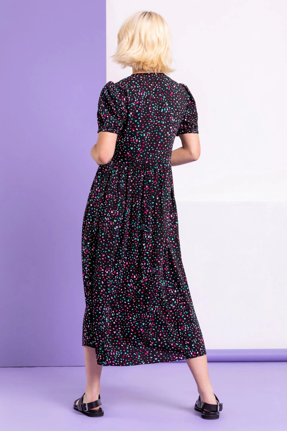 Feel free, floaty and fabulous all season long with our scattered spot print midi dress. Cut to a relaxed silhouette and fastened with a full button opening to the front with cuffed sleeves, this mid-length dress comes in an all-over bright print with a gathered waistline. Pair with your everyday trainers for a casual daytime look or dress it up with heeled sandals and a clutch for a playful evening look.