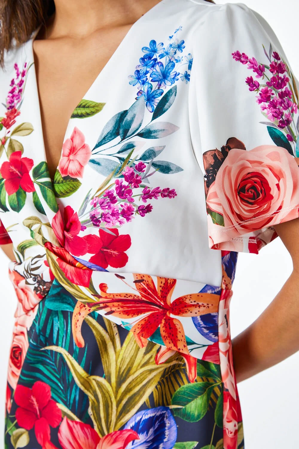 Adorned in floral print, this figure flattering dress has a central twist detail with slight gathering that falls along the bodice. Created with scuba material, v-neckline and short sleeves. Style with court heels for those summer occasion events, or take it into the evening with simple jewellery and a clutch bag for an evening ready look. The ideal staple for any wardrobe that will suit a multitude of occasions.