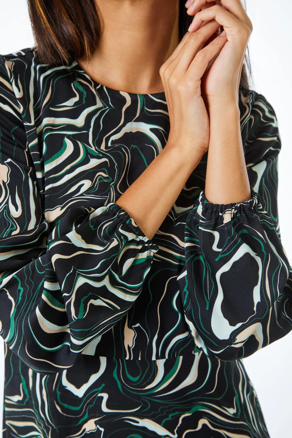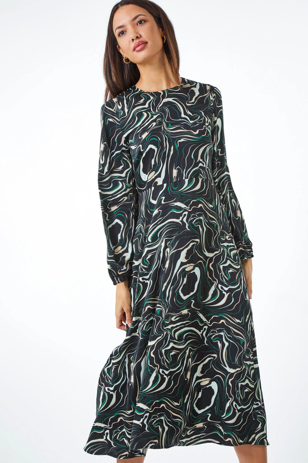 Marble in this modern midi dress this autumn and update your print collection. Adorned in a unique marble print with full length sleeves, this all over printed dress can be worn from day to night with ease. Elasticated cuffs and a back button fastening make this so easy to pull on over the head. Throw over a smart blazer for an instantly stylish workwear ensemble, or keep it casual with some tights, boots and a biker jacket for those autumnal day trips!