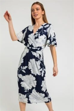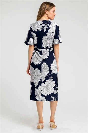 Flaunt your florals this Spring Summer with this pretty flower print tea dress. Featuring a v-neckline and flattering fit & flare shape, this jersey dress comes with 3/4 length sleeves and a matching belt to the waist. Wear casually for an everyday look or for the warm evenings to come this season. Dress up with a jacket, tights and boots for the perfect winter alternative.