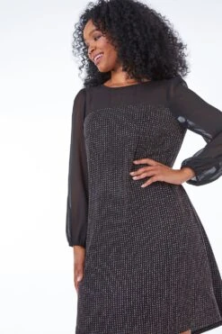 Turn heads in this petite glitter mini dress. Cut from a stretch jersey fabric this is easy to style and wear. It features an eye catching sheer neck and full length blouson sleeves adding a touch of elegance. Its main body is adorned in a sparkling shimmer which will catch the light beautifully as you dance the night away. Cut in a flattering shift shape, this above knee length style is playful and fun. Pair with heels and you’re ready for you next event!