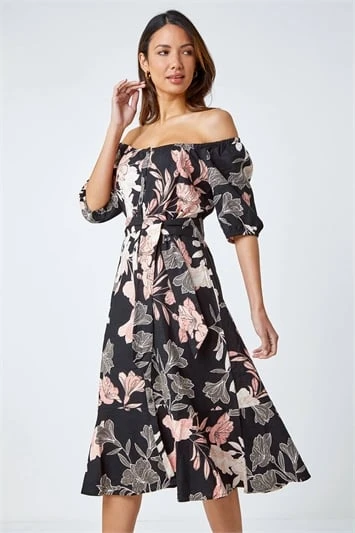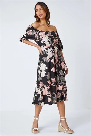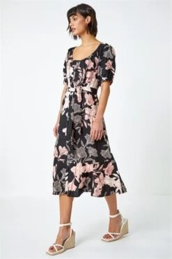 Feel flamboyant in florals this season, this dress is a showstopping staple! Cut from a lightweight chiffon that’s adorned in a vibrant floral print, this midi dress makes a real statement with print. This garment is designed with a flattering wrap detail, a feminine v-neck, short angel sleeves and floaty frilled details throughout. We recommend pairing this dress with a strappy heel to ensure you’re turning heads at all of your upcoming occasions, from a day at the races to that dreamy Wedding ceremony!