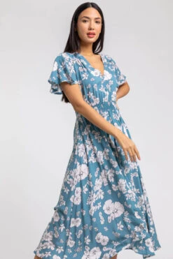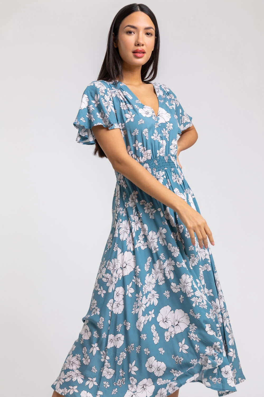 This beautiful midi length dress is everything you want a summer dress to be. Cut with a flattering v neckline, a shirred waist and short sleeves, this beautiful dress is adorned in an all over floral print perfect for garden parties and all occasions. Finished with a fit and flare design, this timeless piece looks great teamed with sandals.