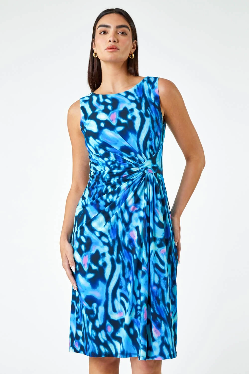 Take a walk on the wild side with this wrap detail knee length dress. Adorned in an abstract animal print thatβll be sure to wow your party guests, this subtle fit and flare dress is the perfect choice for any Summer occasion. Detailed with gathered draping from the waist, a classic round neck and a v-back, this easy to pull on dress has a stretch fabric that is so comfortable. The sleeveless shape is perfect for the warmer season whilst the twist detail cinches you in. Pair this piece with some strappy heels for a look that screams Summer glamour.