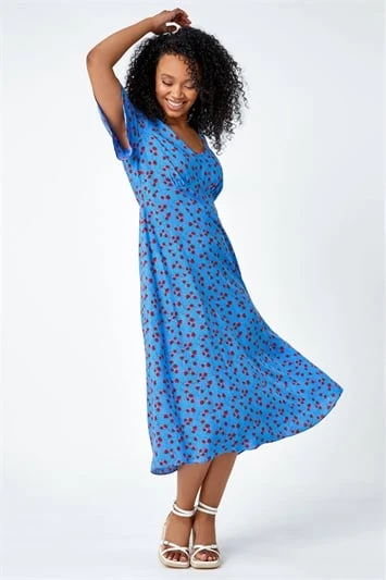 Stay cool this Summer in this ditsy, floral print dress. Cut from a lightweight woven fabric, this dress exudes a modest and stylish energy. This Petite piece features an elasticated waistband, round neck & sweet short sleeves to ensure a flattering fit throughout. Designed to pull on overhead, this is perfect paired with your favourite sandals, ready for the holiday season!