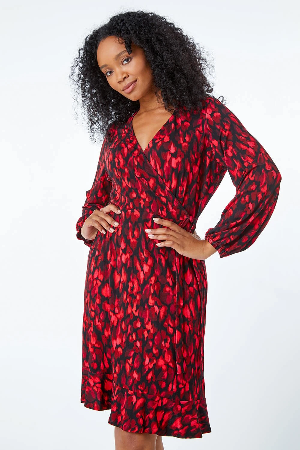 Step into autumn in style with this bold animal print wrap dress! Crafted from a comfortable stretch jersey that is so easy to pull on, this style has a tie at the waist and a mock wrap shape. The fit and flare shape is complemented by full length sleeves and elasticated cuffs. Top off the look with ankle boots and a gilet for the perfect everyday ensemble.