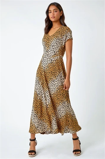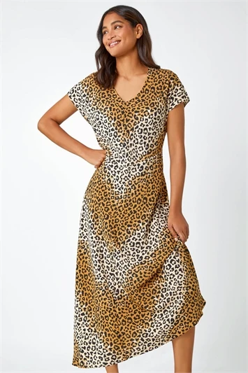 Treat yourself to a wild style this season with our floaty animal print midi dress. It boasts a flattering tiered silhouette and feminine midi length with short sleeves and a notch neckline. Adorned in a tonal leopard print, this frill hem style is great for casual Summer days. Just add sandals for a walk in the park or style it up with a denim jacket over your shoulders!