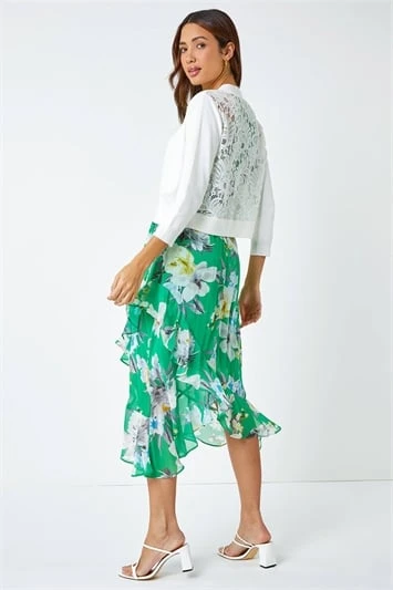 Timeless and elegant in every way, this dipped hem midi dress is a real occasion piece. This statement jacquard dress has a demure round neckline, sleeveless body and striking asymmetric hemline with frill detail. It is fastened with an easy concealed zip and has a statement swirl print design. Style this fit and flare number with a clutch bag and heels for an evening date or reach for a fascinator and bolero for a Wedding reception to remember!
