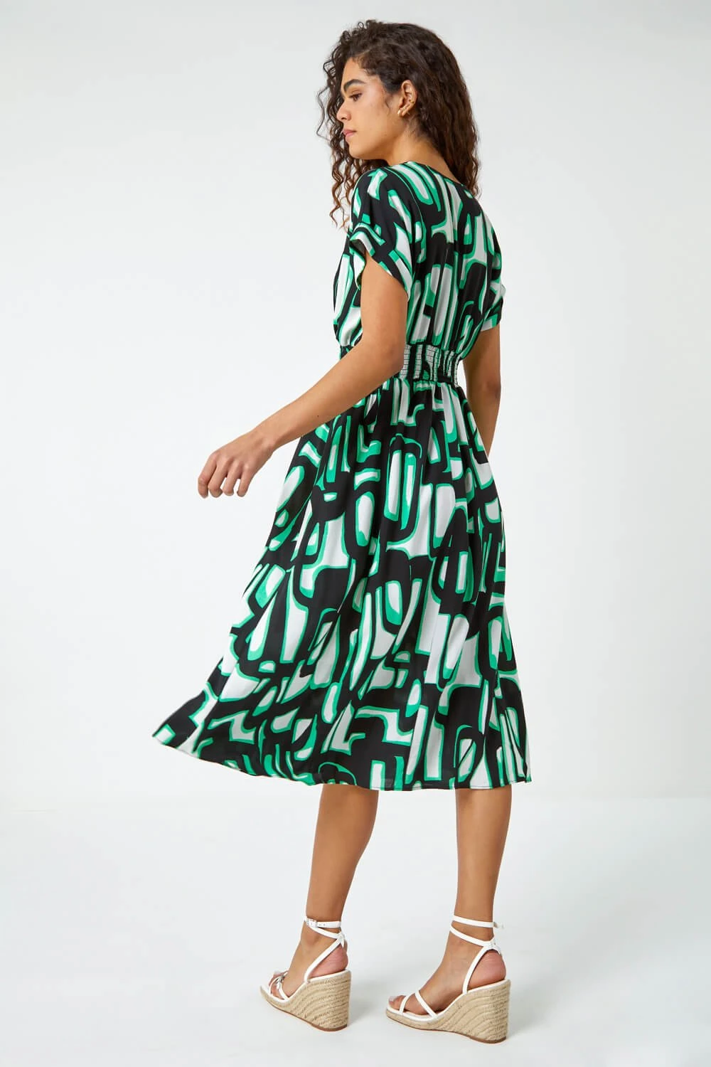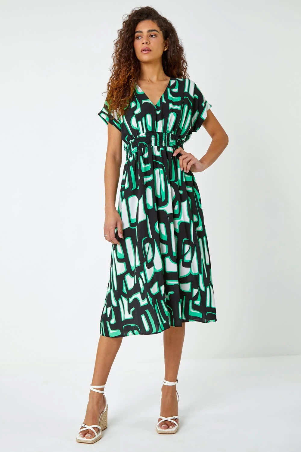Experiment with some new prints this season with this abstract, geometric print midi dress. Cut from a cool, woven fabric this dress features a feminine v neckline and relaxed, short sleeves with cuffs. A ruched waist creates shape while the fit and flare skirt falls to a modest midi length. Its unusual print in on trend colours really catch the eye. Add heeled wedges for those long Summer nights with friends!