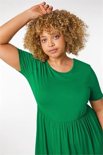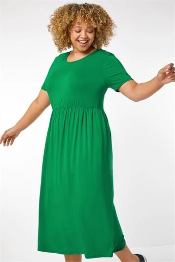 Adorned in a feminine, floral print this curve midi dress is fun and easy to wear. Cut from a stretch jersey fabric this piece features an unusual square neckline and short sleeves. An elasticated empire waistline ensure a loose and flattering fit throughout the piece. Designed to pull on overhead for comfortable and quick dressing, this piece is perfect with fresh trainers and a denim jacket!