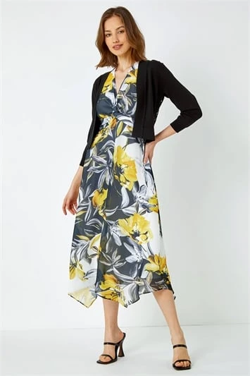 Step into the season with this abstract print knee length dress. Cut into a Summery sleeveless silhouette with a round neckline, this stylish fit has gathered draping at the waist for a figure flattering statement. Perfect for those Summer occasions where you need that “wow” factor this dress has a sultry v-back and twist at the front to cinch you in. Wear this piece with some killer heels and a smart cover up and you’re ready for a day at the races.