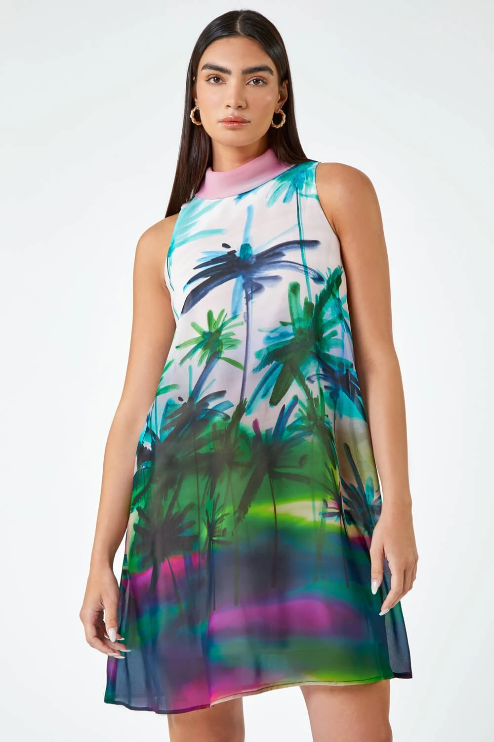 Give a nod to the 60βs with this intricately printed swing dress. Detailed with a contrasting roll neck and light sleeveless silhouette, this trendy shift dress is ideal for Summer occasions. This limited edition piece has a keyhole detail at the back with a gold button closure and full lining. This sensationally Summery dress oozes elegance whilst remaining comfortable with its relaxed shape. The tropical inspired palm print that adorns this dress is like a work of art. Wear with strappy heels and let the dress take centre stage at your next special occasion.
