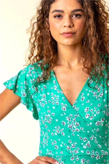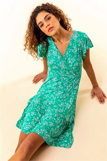 Get garden party ready with this Petite printed dress. Cut from a smooth woven fabric this dress features a feminine v neckline adorned with a floaty ruffle trim. Designed with sweet short sleeves this dress is adorned in a ditsy floral print. The wrap style, knee length skirt is trimmed with delicate frills adding texture and movement throughout the piece. Pair with a denim jacket and heeled wedges for effortless Summer style!