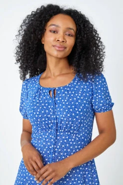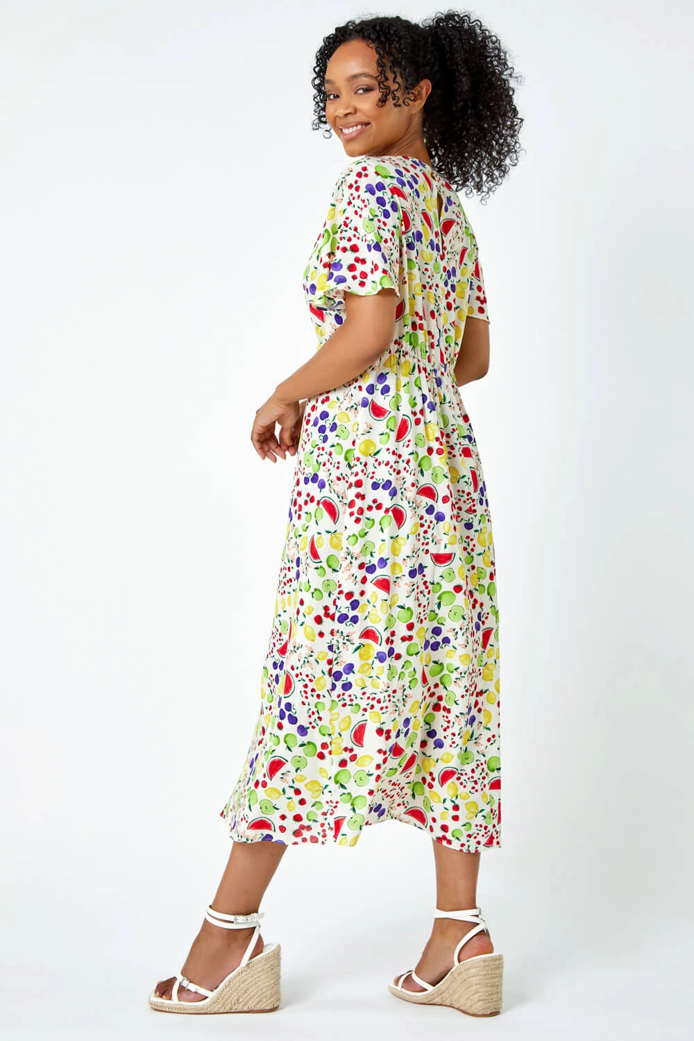 Have some fun this season with this playful Petite, fruit print tea dress! Cut from a smooth woven fabric this dress features a feminine v neckline and short angel sleeves. An empire waistline ensures a flattering fit throughout, while the skirt falls to a modest midi length in a classic fit and flare style. Pair this piece with a lightweight jacket and heeled wedges for bold Summer style!
