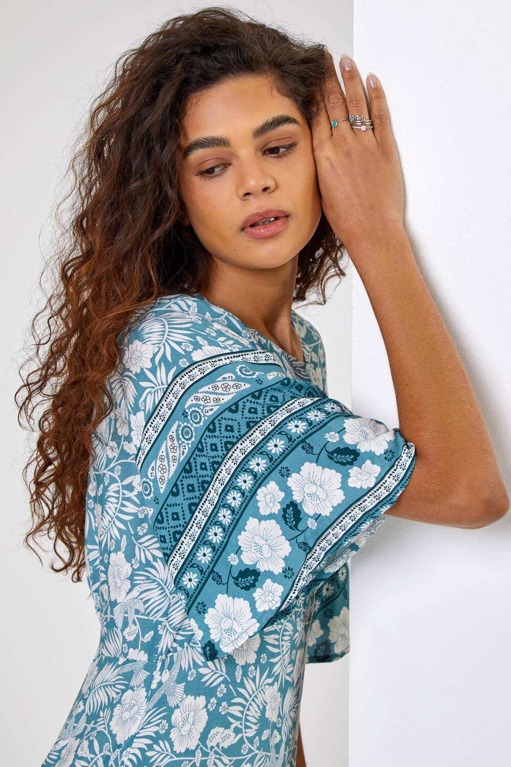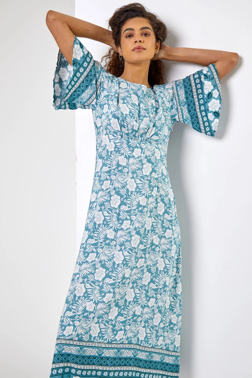 A new summer favourite in this floral simple but elegant dress. This number offers a round neckline with short angel sleeves with a contrast border hem. Simply add sandals and a denim jacket for a stroll in the park or a cropped jacket for a garden party.