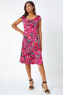 Stay cool this season with this classic cut shift dress, a staple for any Summer wardrobe. Featuring a floral border print, this sleeveless Petite dress is fastened with a single back button. Cut with comfort in mind, this easy to wear knee length dress is perfect paired with heeled wedges and a lightweight jacket for effortless holiday style!