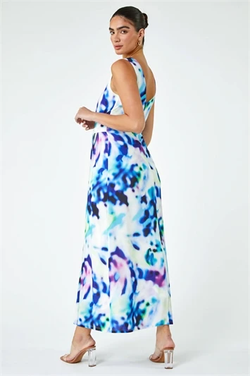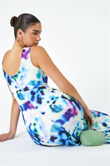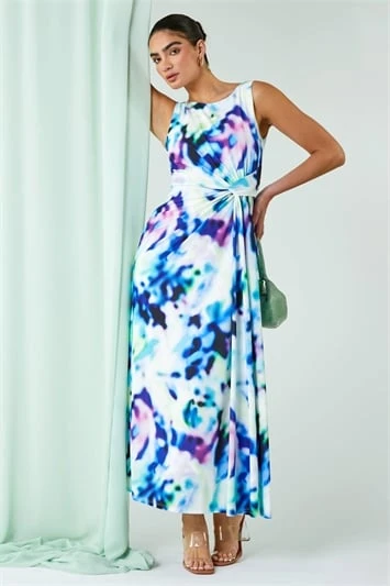 Take your occasionwear to the next level with this vibrant maxi dress. Easy to pull on overhead, this sleeveless style has a flattering drape detail at the side waist and a timeless round neckline with stunning v-back. This full length dress exudes evening glamour with its silky, stretch jersey body that skims your figure beautifully. The plain colour makes this style so versatile for accessorising with bold patterned clutch bags and sparkling jewellery. Simply add a fascinator and heels for your next Wedding or day at the races!