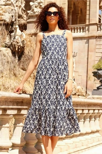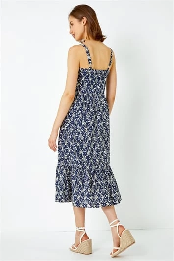 Feminine and fun for the new season, this pretty fit and flare dress is just what your wardrobe needs! Decorated with broderie flowers, this gathered style finishes at a midi length with a scallop hem. The linen cotton blend material makes this dress so light and breathable for the Summer. It has a sleeveless shape, cami straps and a sweetheart neck with button front. It has a stretch shirred back, making it easy to pull on and go. Style with a denim jacket and pumps for casual Spring outfits!