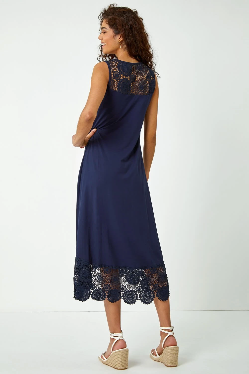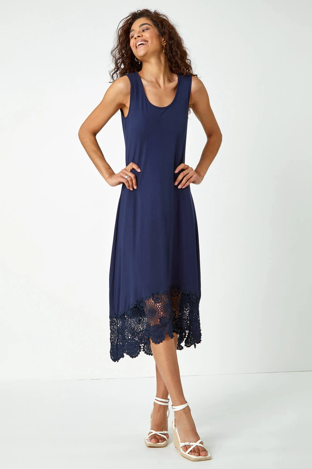 This sleeveless dress is a holiday and summer essential. Made from a soft, lightweight fabric it is breathable and lose fitting, keeping you comfortable in the summer sun. This midi length dress is finished with a crochet trim for on trend detailing. Easy to pack into your suitcase for your next cruise or city break, you can wear this dress from day to night by dressing it up with accessories or keep your look simple with sleek black sandals and a hat.