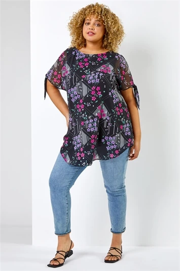If boho is your vibe then so is this Curve paisley print midi dress. Fit and flare shape offering a shirred waist for a flattering silhouette, featuring a v-neck with mock tie to centre front, elasticated short cuff sleeve finished with a frill hem. Team this knee length number with a denim jacket and sandals for an everyday look.