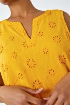 This cool 100% cotton style is designed in a Summer-ready sleeveless style, ready for the warmer weather ahead. It features a round neckline, is cut in a flattering shift style and finishes at the knee. Adorned in delicate, contrast embroidering this piece is both playful and pretty. Finished with a stylish concealed back zip, complete the look with heeled wedges!