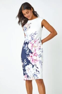 Feel good in florals this Summer with this timeless occasion dress! This premium stretch shift dress comes in at knee length, adorned in a bold floral print with contrasting border. Detailed with a round neck that falls into a v at the back, this sleeveless dress is a perfect choice for a day at the races or Wedding ceremony! Pair this scuba style with a killer heel for a put together Spring Summer style.