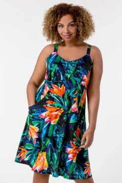 Spice up your seasonal wardrobe with this tropical piece! Our V-neck strappy summer dress is a fun, knee-length dress that is perfect for packing in your holiday suitcase. This wide strapped dress is cut from a stretch fun all-over print fabric. The shaped empire waistline flatters the curves and did we mention that it has pockets? Pack this fun piece in your suitcase and pair it with sandals for a striking look in seconds.