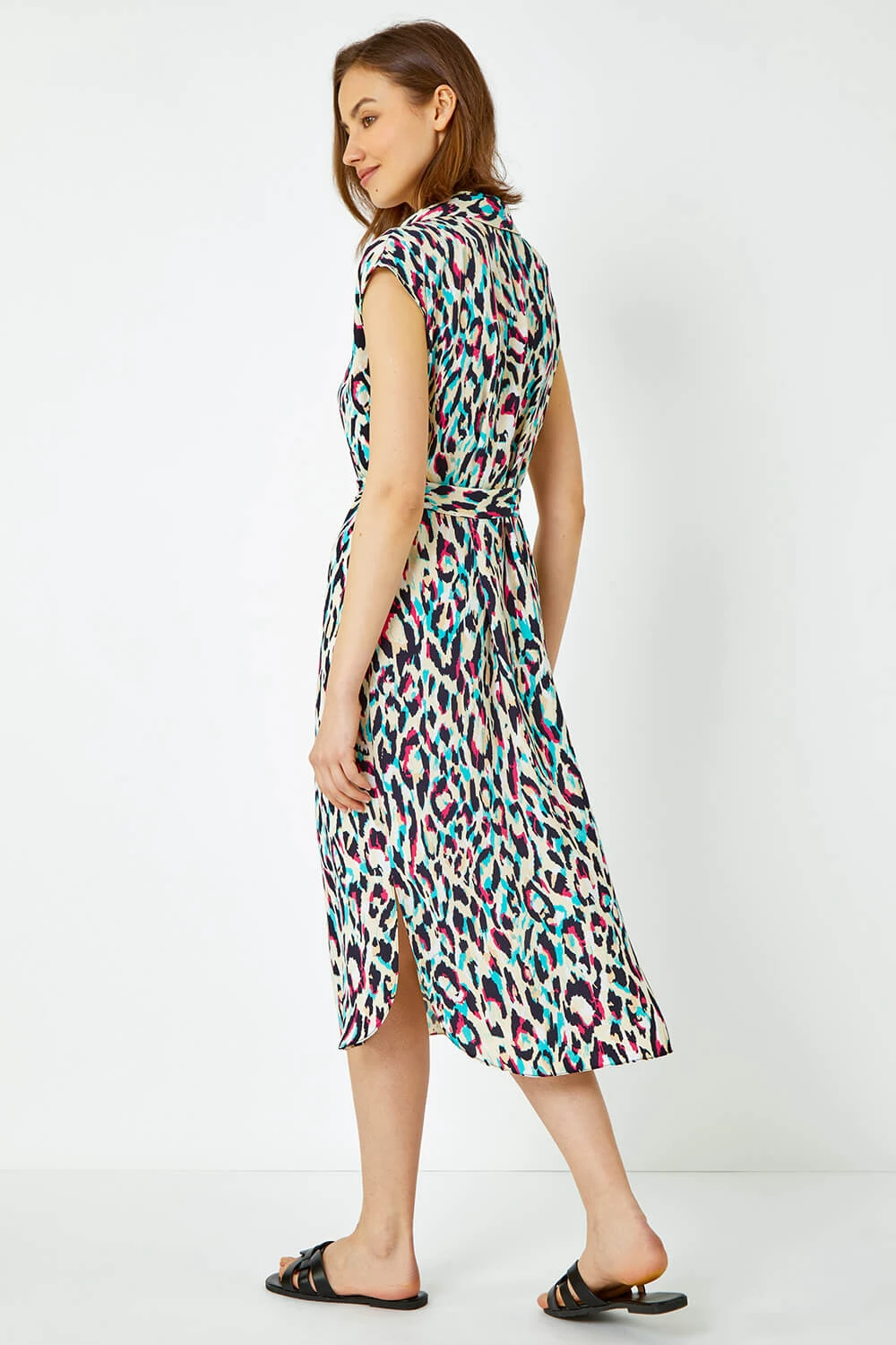 A tie waist shirt dress will always be in style! Cut to a timeless silhouette, this v-neckline is finished with a smart shirt collar and vibrant leopard print. This midi length dress is topped off with subtle side splits and a self tie belt. Made from a lightweight woven fabric with short sleeves, this style is perfect for Spring Summer and can be worn with a denim jacket and sandals for the ultimate daytime look.