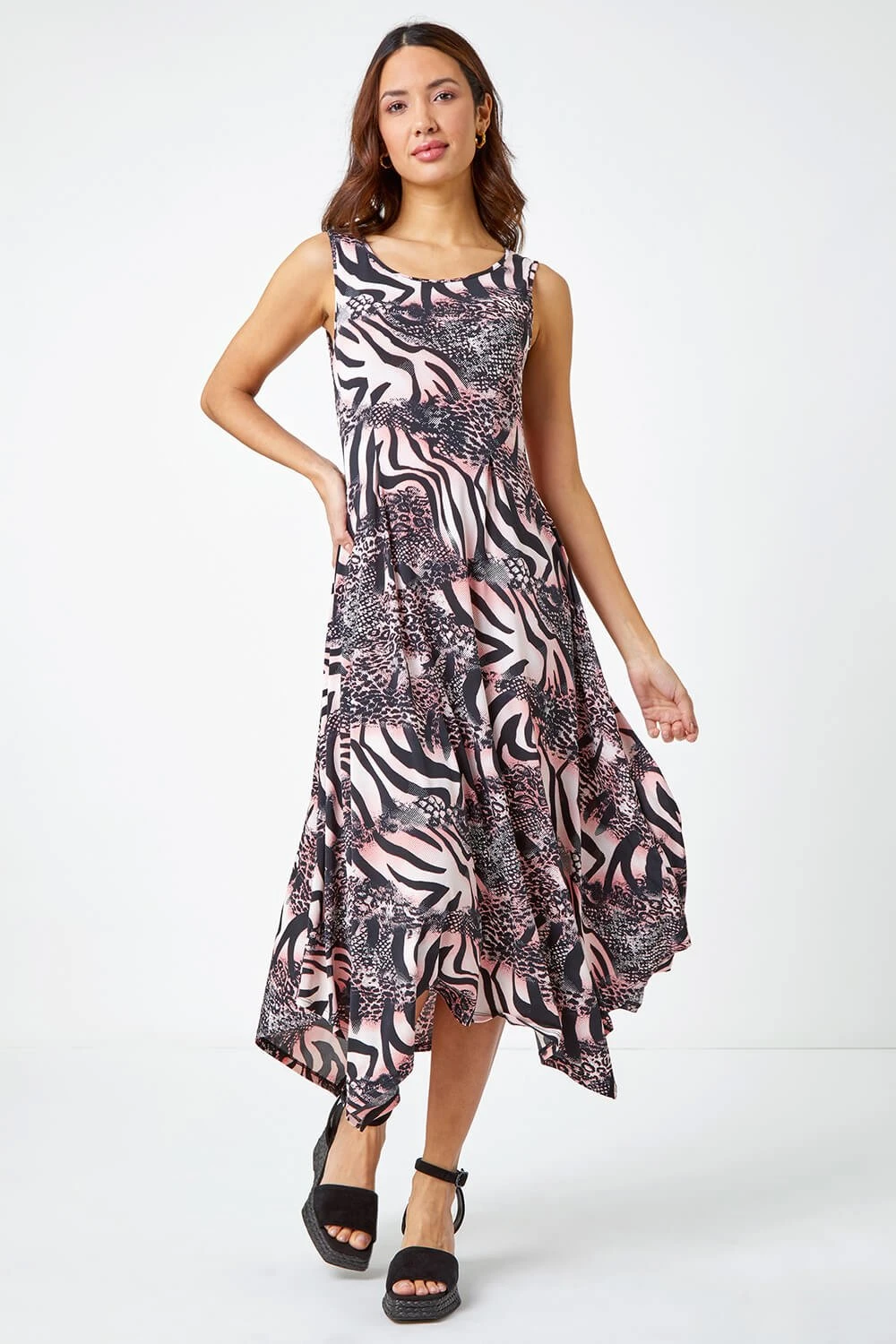 A stunning choice to see you through all of your Summer events, from garden parties to holidays and beyond. This sleeveless midi dress features a round neckline and thick secure straps. Cut from a flattering stretch jersey fabric this dress features our popular hanky hemline and is adorned in an abstract animal print. This fit and flare styles is easy and quick to slip on, just add your occasion appropriate shoes and you’re good to go!
