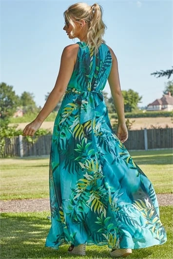 Tropical vibes are all the rage this season, an absolute must-have in your spring summer wardrobe! Cut from a lightweight fabric, this dress features a keyhole detail to back with a matching belt and a trendy tiered skirt. This halter neck maxi number is perfect for dressing up or down to suit your occasion, add sandals and a light jacket to keep your style casual or alternatively add heels and a clutch to add some flare to your occasion wear.