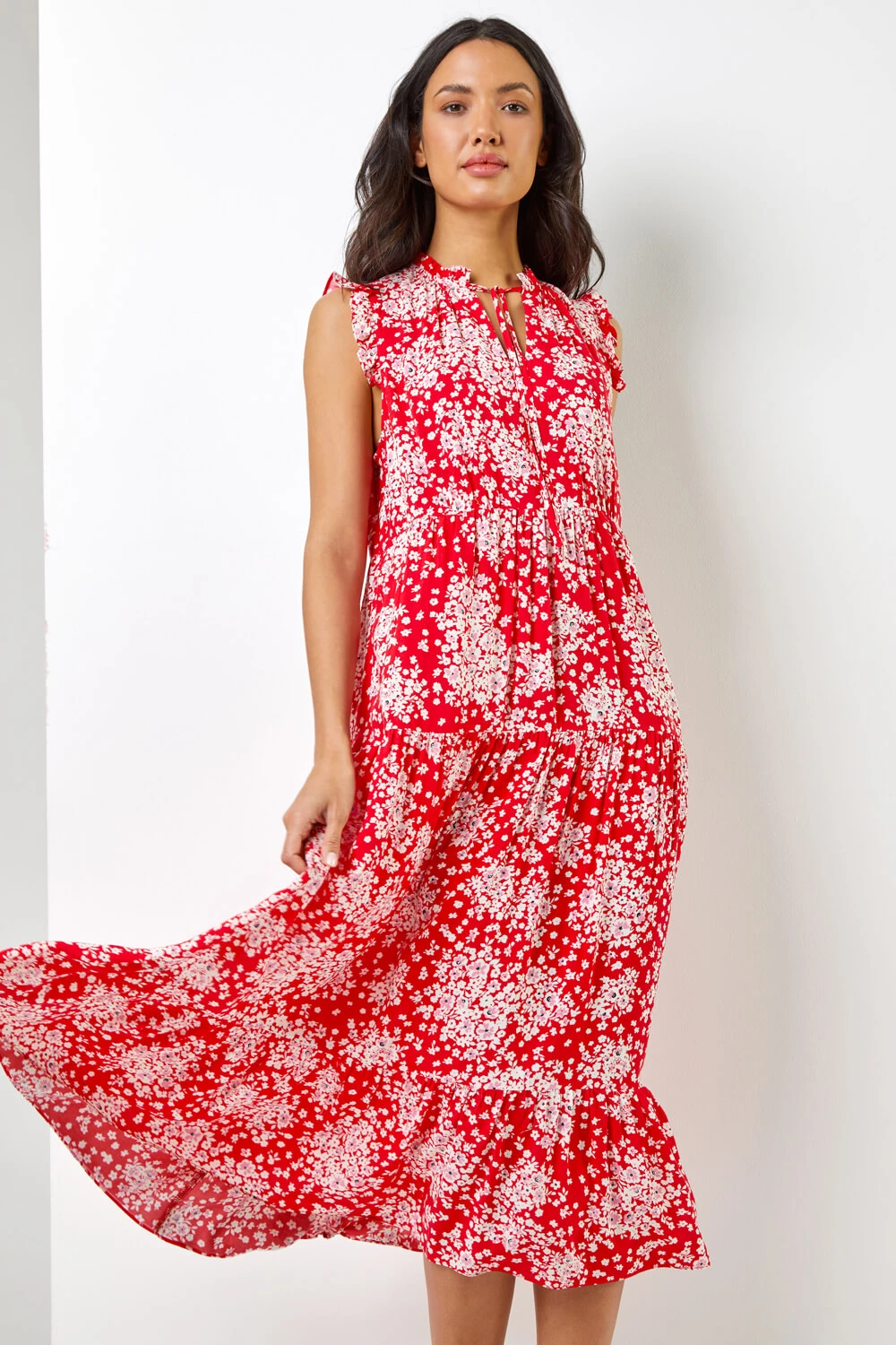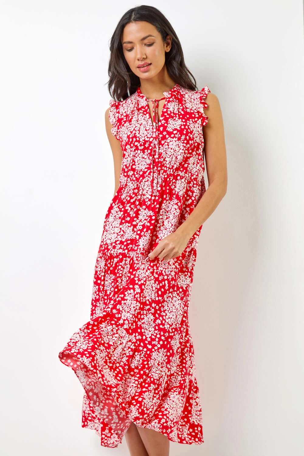 Ditsy Floral Print Frill Detail Maxi Dress Flourish in florals with this exquisite Roman maxi dress. Made with such a seamless silhouette, with frill detailing along the neckline and arm holes, with a neck tie detail that flows into a flattering tiered skirt. This dress is the ideal piece for this upcoming season, elegant and equally stunning, itβs a dress that needs minimal styling. Pair it with some sandals and a crossbody for a made up day look or wedges and a sun hat for an effortless summer look!