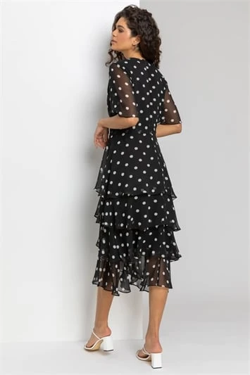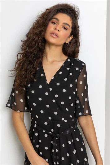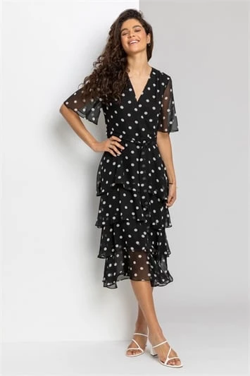 Pretty polka dots adorn this sleeveless, smock dress. Cut from a smooth, woven fabric this piece features a notch v neckline with button fastenings and a flattering self-tie fabric belt. The skirt falls in tiers to the knee length hem, ensuring a loose and comfortable fit. Pair with wedges and a lightweight jacket to complete the look!