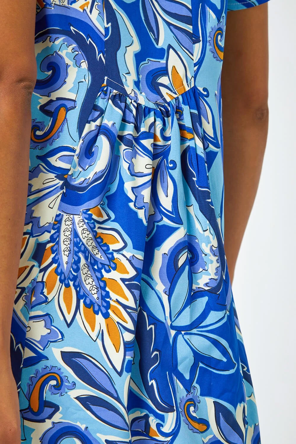 Light and airy for the new season; introducing our relaxed fit tunic dress. Printed in a glamorous baroque floral design with a loose woven shape, this pleat front dress hangs beautifully to flatter the figure. Side pockets make this style so easy to wear in the daytime on holiday or at home when the warm weather hits! It also features short sleeves and a v-neckline, making it so easy to throw on as a pool coverup over your swimwear. Style yours with sandals and a beach bag for your next getaway!