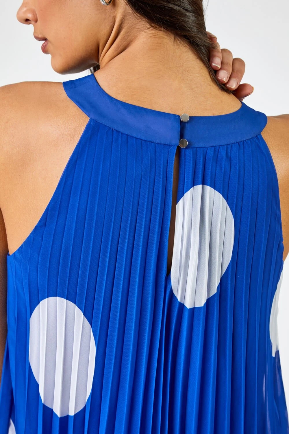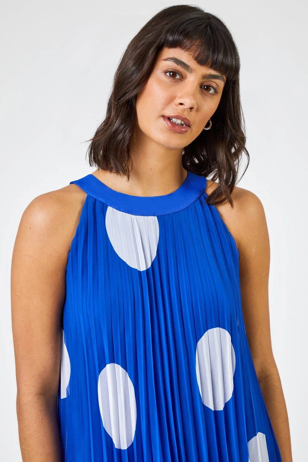 Swing into the new season in your new pleated polka dot dress. This elegant number is fashioned from a lightweight floaty material and cut to a loose flattering silhouette with delicate pleating. This chiffon dress is completed with a keyhole back detail and fastening, pair this timeless piece with some statement heels and a chic bolero for a feminine and classic look for any occasion.