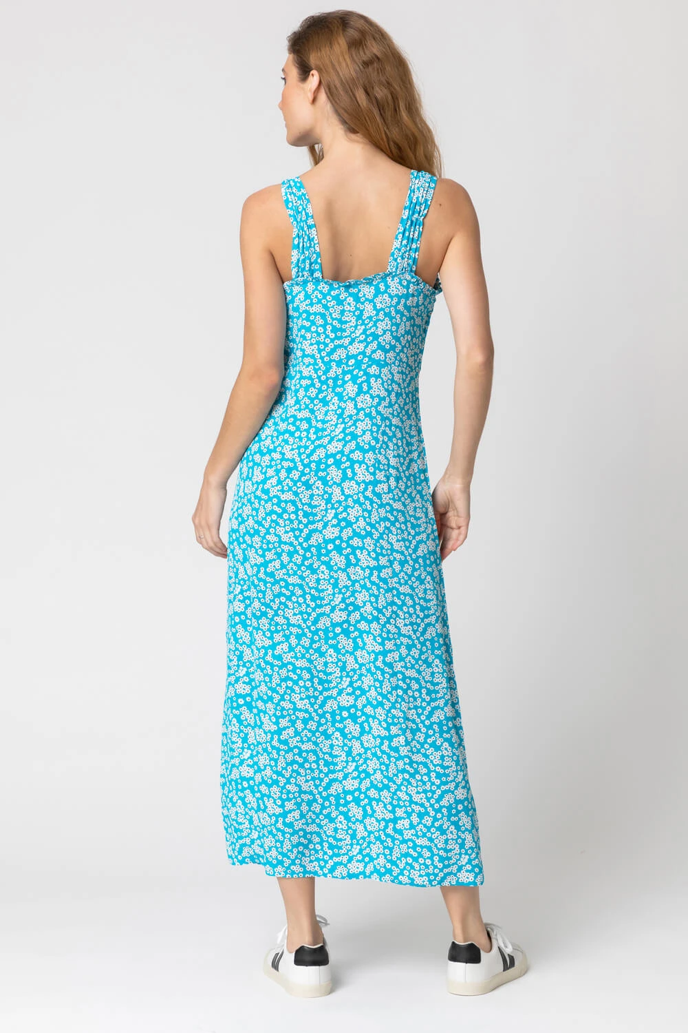 Be ready for whatever the weather this season with our ditsy floral midi-length dress, perfect for a picnic-ready style. With an all-over floral print and wide straps with gather details to help with any bra showing worries, this dress has a button-through fastening down the front and splits to side seams for an added touch of elegance. Finish off with your favourite sandals and a denim jacket for the perfect summer day outfit.