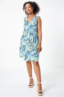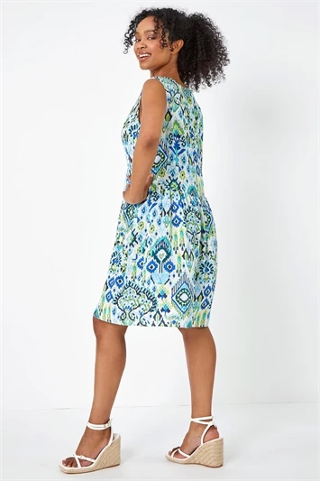 Tick off this seasonβs new trend with this vibrant, Petite Aztec print dress. Designed in a simple sleeveless silhouette, shape is provided with complimentary shirring at the waist. This lightweight midi dress is designed to pull on overhead, for an easy option for a chic yet comfortable look this Summer. Pair with some sandals and a lightweight jacket for a breezy holiday look!