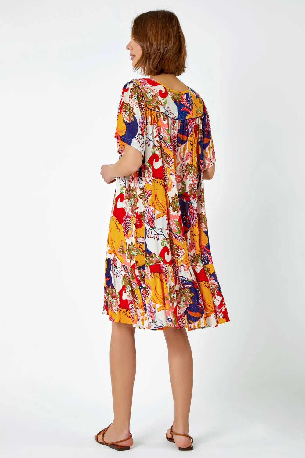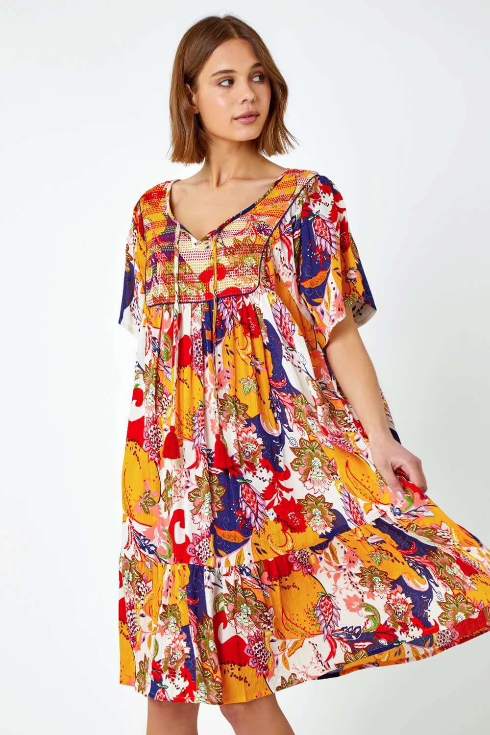 Style and comfort combined, this sun-ready dress has casual written all over it! It features a short sleeve silhouette with a subtle dipped hem as well as a fashionable tropical print design and tassel tie detail. This feminine favourite has a frill at the hem and flattering v-neckline. Crafted from a light woven material with a unique stitch detail, this smock dress is sure to turn heads on the beach. Ideal for throwing over your holiday swimwear or keeping cool at home, this everyday dress is a Summer staple.